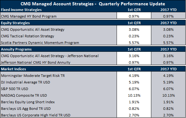 Following is the 2017 first quarter performance for CMG’s Tactical Investment Strategies along with our thoughts on each strategy over the past quarter.  Market index performance is presented at the bottom of the chart.