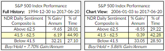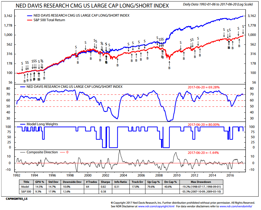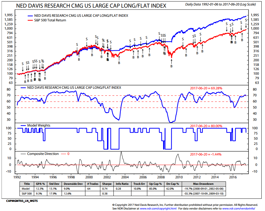 The NDR CMG U.S. Large Cap Long/Flat Index remains in a partial sell signal. It moved from 100% S&P 500 Index exposure to 80% S&P 500 Index exposure (with the 20% balance in T-Bills) on Tuesday, June 13, 2017.