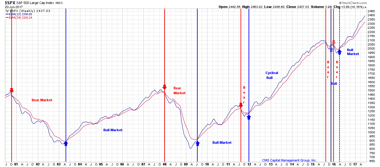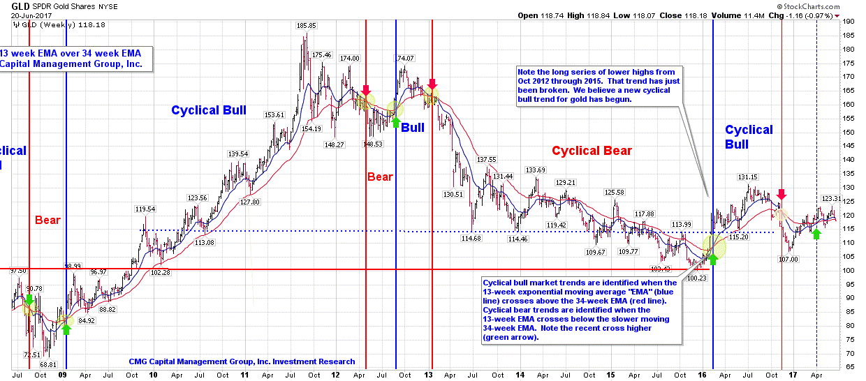 Note (in the chart below – upper right-hand corner) that the 13-week EMA (blue line) has crossed above the 34-week EMA trend (red line) late first quarter 2016 (a trend buy signal). The Cyclical Trend for Stocks is bullish by this measure. You can see that this trend process has done a pretty good job at identifying the major cyclical bull and bear market trends (note small red and blue arrows). A good stop-loss level may be at the point when the 13-week drops below the 34-week.