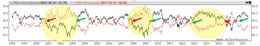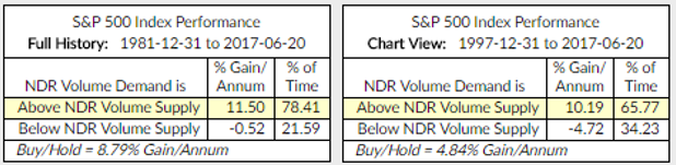 The process looks at a smoothed total volume of declining issues versus a smoothed total volume of advancing issues using a broad market equity index. The performance below is when Vol Demand is above or below Vol Supply. More buyers than sellers or more sellers than buyers. This is a relatively slow-moving but important indicator.