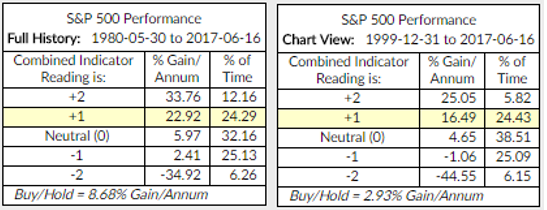 - The chart below shows Gain/Annum based on the combined indicator reading (1999 to present). Current indicator score is highlighted in yellow from 1980 to present (including the great bull market of 1980 to March 2000). Same conclusion. Don’t fight the Fed or the Tape: