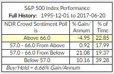 NDR Crowd Sentiment Poll: Extreme Optimism (S/T Bearish for Equities). Current reading highlighted in chart below. The current weekly sentiment reading is 69.5. It was 69.5 last week. Best buying opportunities occur at “Extreme Pessimism” readings below 57.