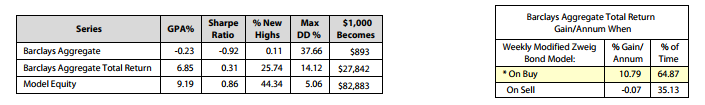 - Barclays Aggregate Bond Total Return has a max drawdown of -14.12% vs. a max drawdown for the Zweig Bond Model of -5.06%.