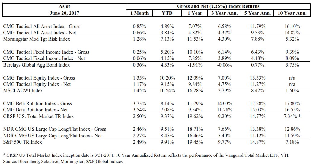 The CMG Tactical Fixed Income Index, CMG Tactical All Asset Index, CMG Tactical Equity Index and CMG Beta Rotation Index (the “Indexes”) are rules-based indexes that reflect the theoretical performance an investor would have obtained had it invested in the manner shown and do not represent actual returns, as investors cannot invest directly in the Indexes. The Indexes’ returns represented do not reflect the actual trading of any client account. No representation is being made that any client will or is likely to achieve results similar to those presented herein. Unless specifically noted, performance results are presented net of a 2.50% maximum annual fee deducted from the account balance quarterly, in arrears.